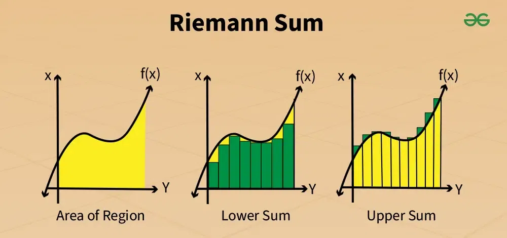 Riemann Sum A Riemann sum approximates the integral of a function by partitioning an interval into subintervals, choosing sample points xi, and summing ∑f(xi)Δx the integral is the limit of these sums as the partition becomes finer. That is Δx→0 Graphic